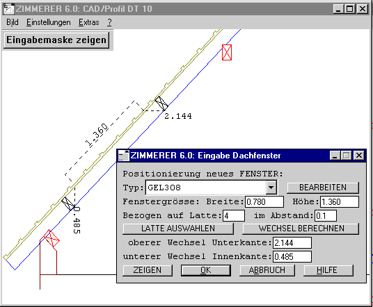 Entweder nach Wahl von Dachbausteinen direkt über das Profil (geht bei einfachen Dächern am schnellsten): über eine einzige übersichtliche Bildschirmmaske geben Sie für jede Dachseite die wesentlichen Daten ein (Dachneigung, Hausbreite, -länge, Pfetten- und Sparrenlage und -dimensionen). Während der Eingabe ist jederzeit eine grafische Kontrolle sowie die Einstellung verschiedener Parameter (z.B. Sparrenabschnitt, Typ Hexenschnitt) möglich.